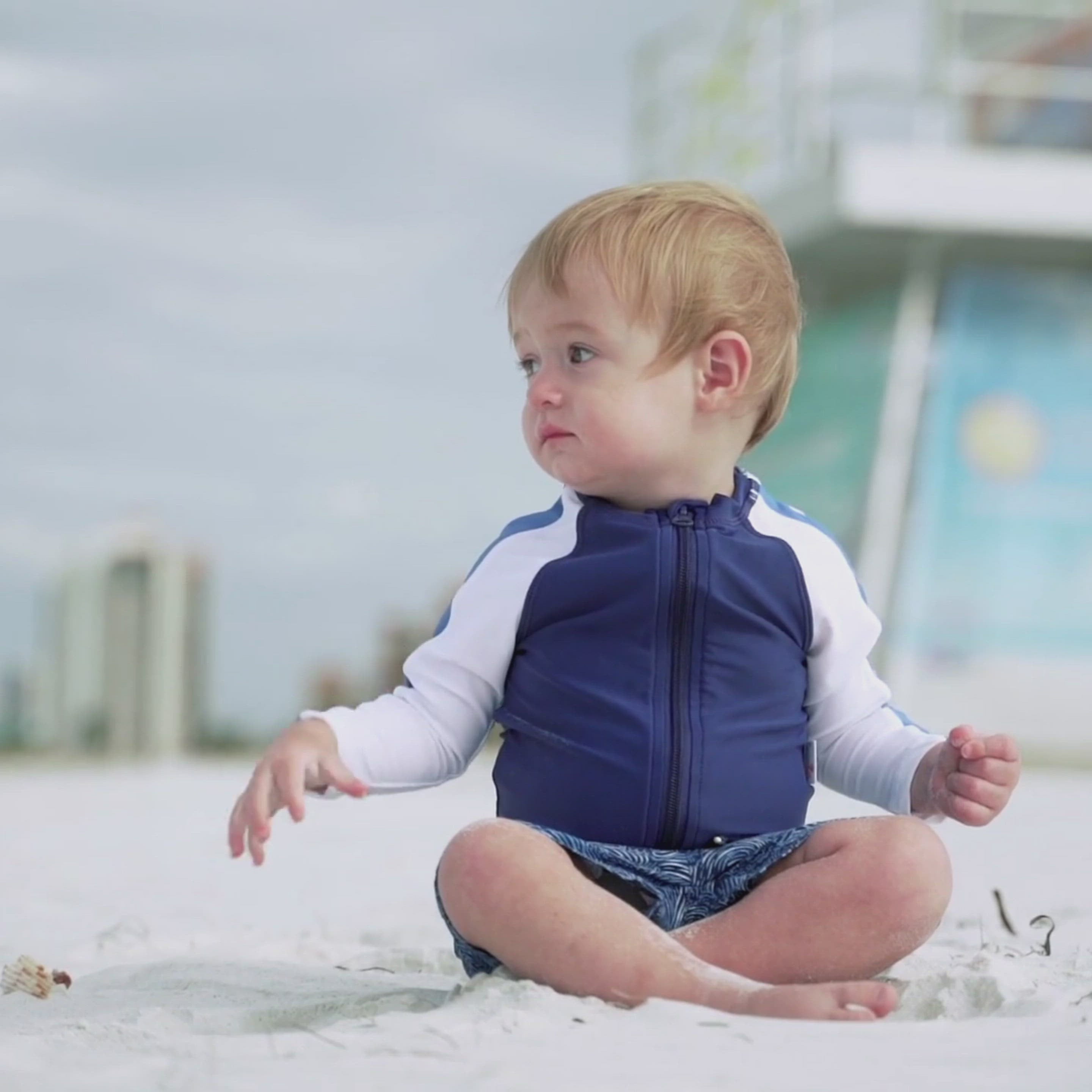 This set includes both comfy trunks and a super easy to get on and off, full zip long sleeve swim shirt. No more sunscreen battles because everywhere that’s covered by SwimZip is protected from the sun’s harmful rays!