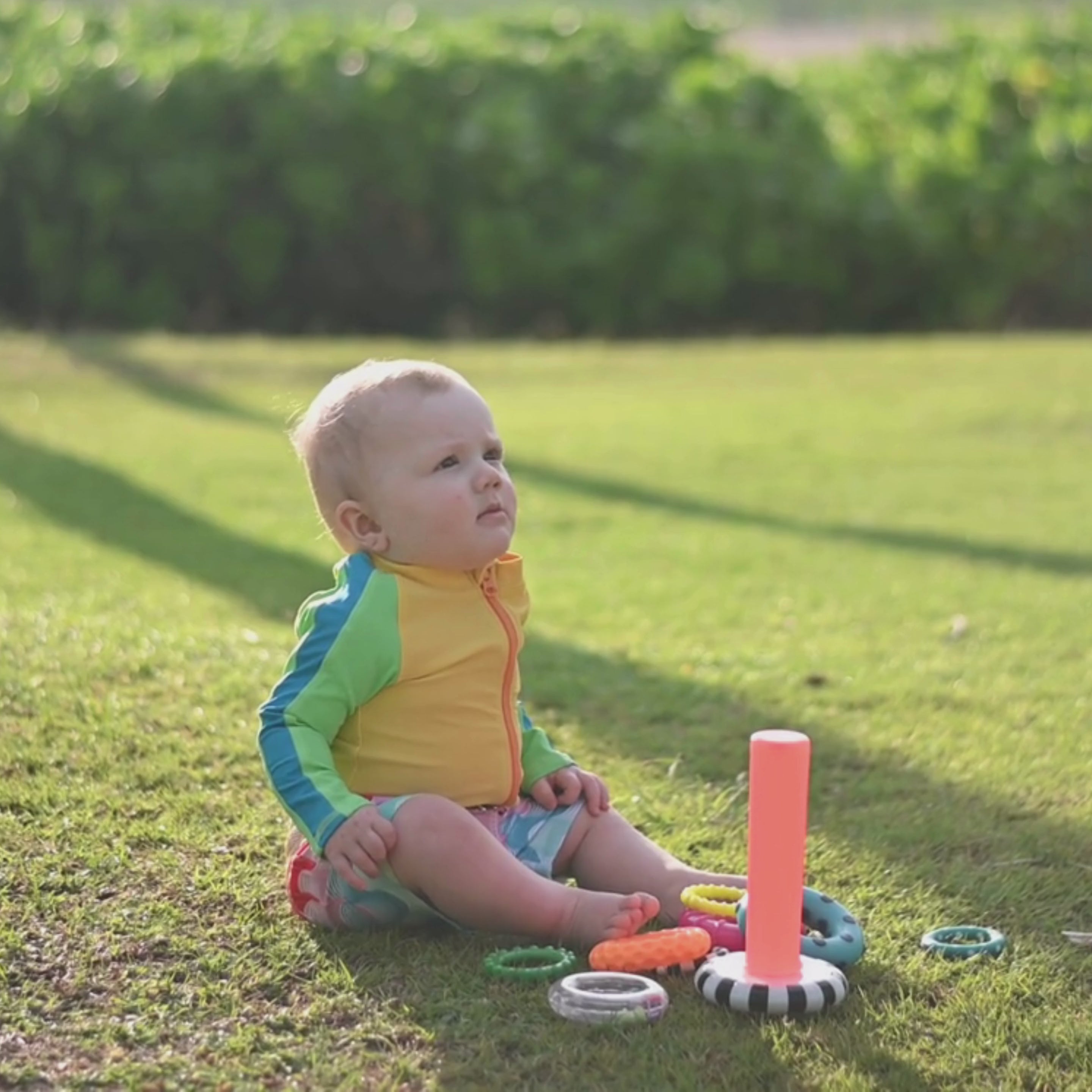 This set includes both comfy trunks and a super easy to get on and off, full zip long sleeve swim shirt. No more sunscreen battles because everywhere that’s covered by SwimZip is protected from the sun’s harmful rays!