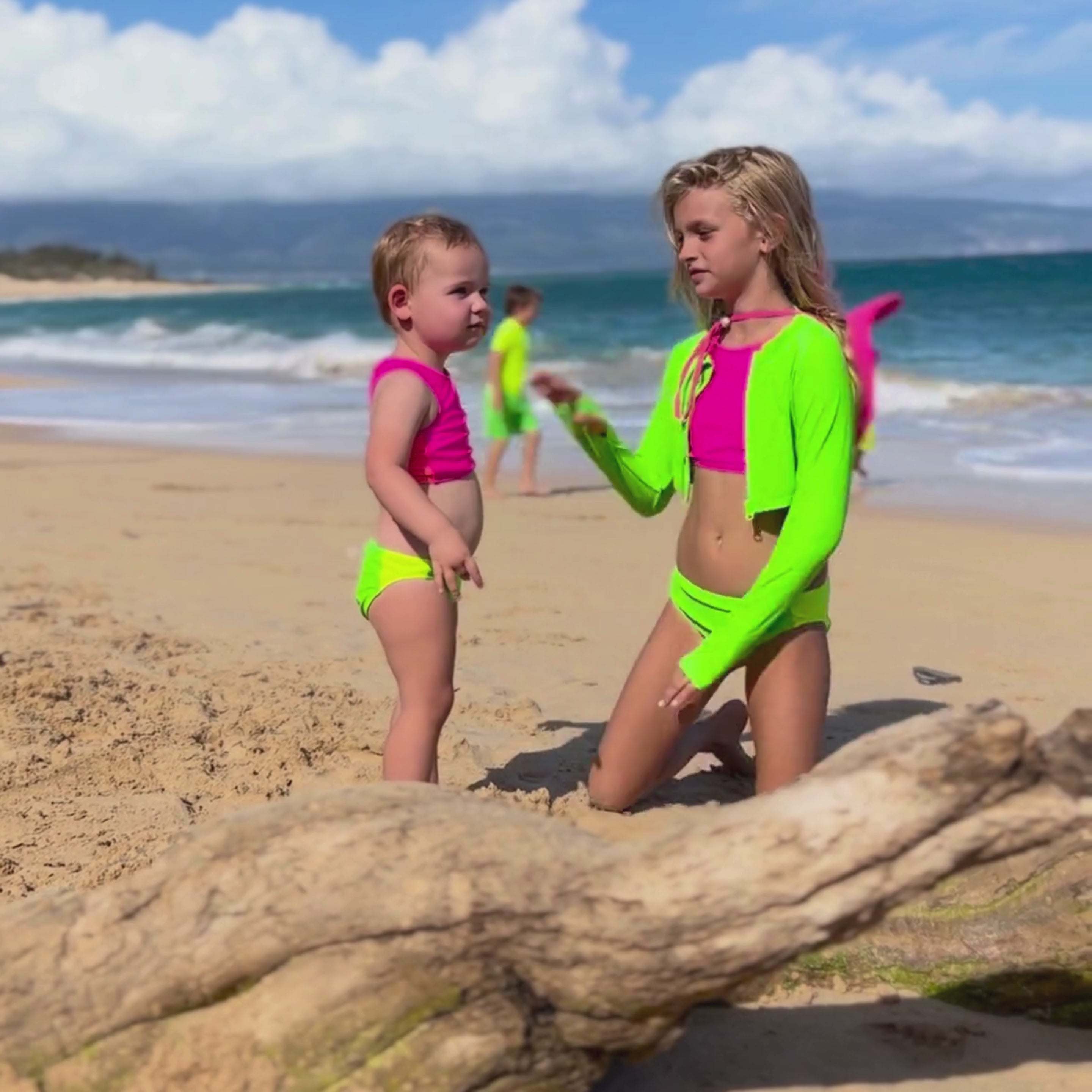 Why neon swimsuits? Besides being fun, bright and several of the best swimsuit colors for visibility, neon are also some of the safest swimsuit colors. There has been much recent discussion about bathing suit color safety and the best swimsuit colors underwater. This vivid neon green is one of the best swimsuit colors for safety ...and it’s just too cute!
