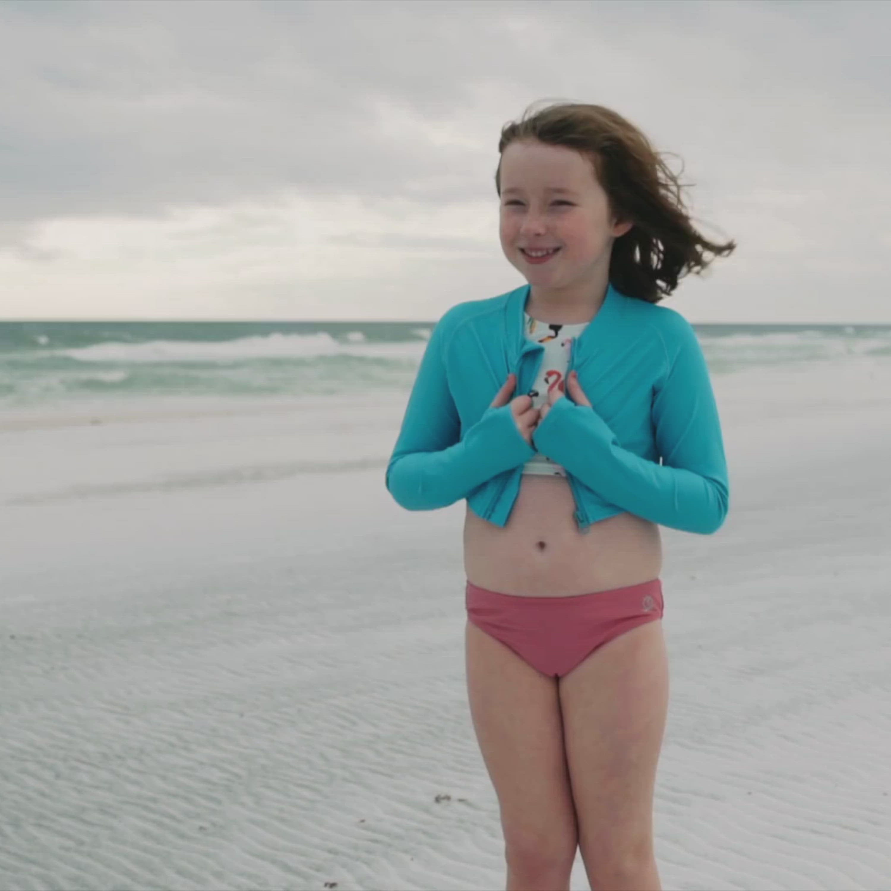 Our girls Crop Rash Guard is perfect for a day out at the beach, pool, or just going for a stroll. This long sleeve cropped swim jacket is the cutest, easiest way to provide extra sun protection, both in and out of the water.