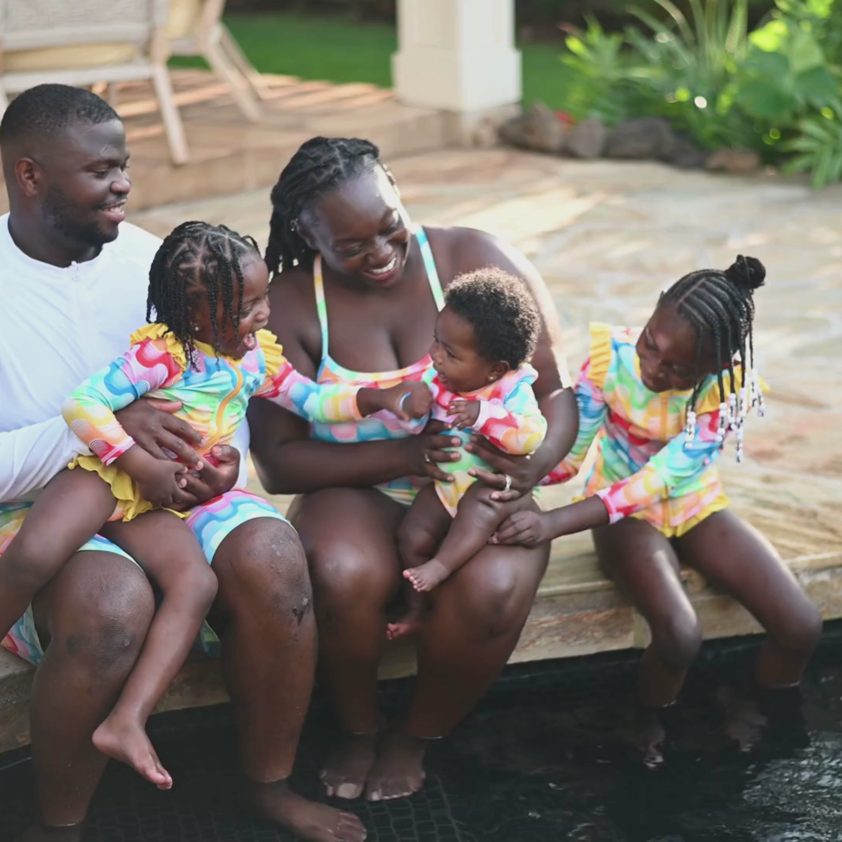How adorable is this long sleeve rash guard ruffle swimsuit set?! She’ll feel extra confident and look extra cute with the delicate ruffle detailing at the shoulders of the swim jacket and along the waist of the swim bottoms. This two piece set with long sleeve swim top and bikini bottoms is just the sweetest way to stay sun safe!