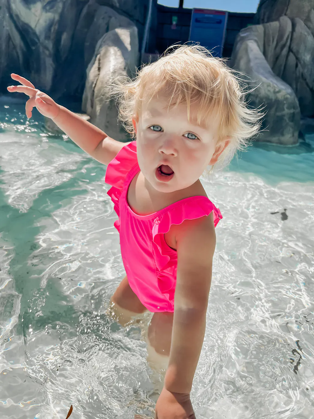 Why neon swimsuits? Besides being fun, bright and several of the best swimsuit colors for visibility, neon are also some of the safest swimsuit colors. There has been much recent discussion about bathing suit color safety and the best swimsuit colors underwater. This vivid neon pink is one of the best swimsuit colors for safety ...and it’s just too cute!