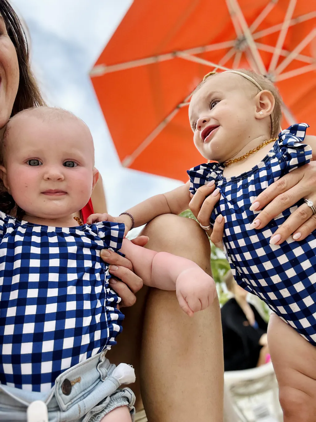 This "Too Sweet” ruffle one-piece swimsuit is perfect for your girl on the go! She’ll love the ruffle details down the front of the suit and you’ll love features like adjustable straps and easy change diaper snaps on infant sizes!