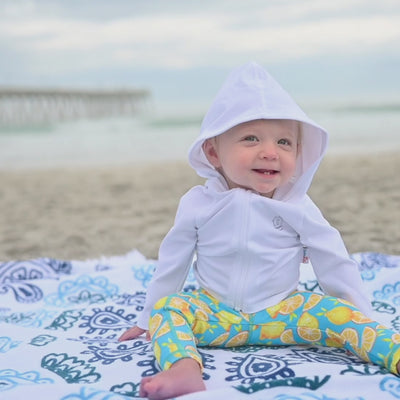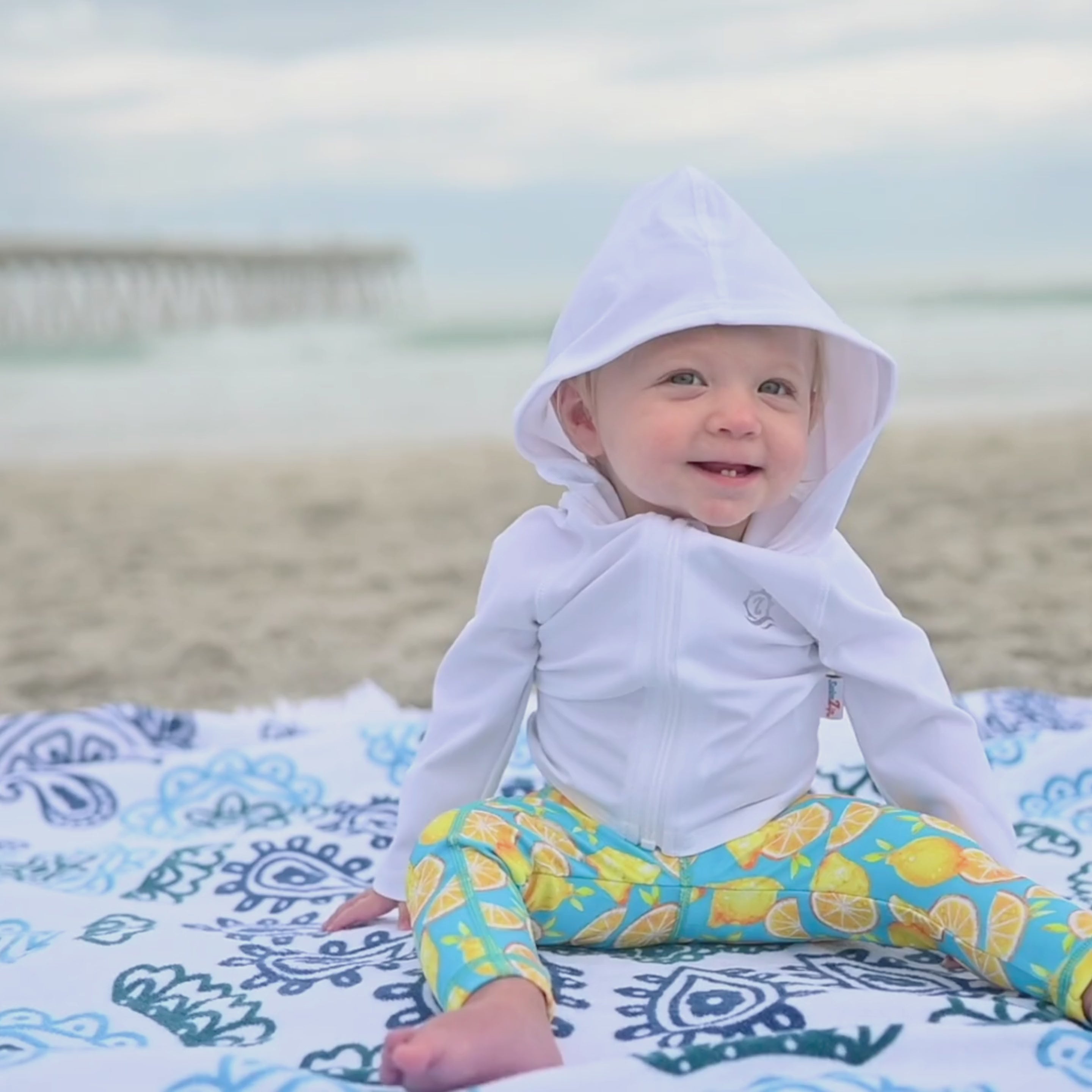 Our signature long sleeve rash guard with a bonus! A two-panel hood with stand collar to provide sun protection for the entire neck area. Making it the absolute best UV protective swim jacket to keep your kiddo protected from the sun all day long. It’s perfect for the pool, beach, and everywhere in between.