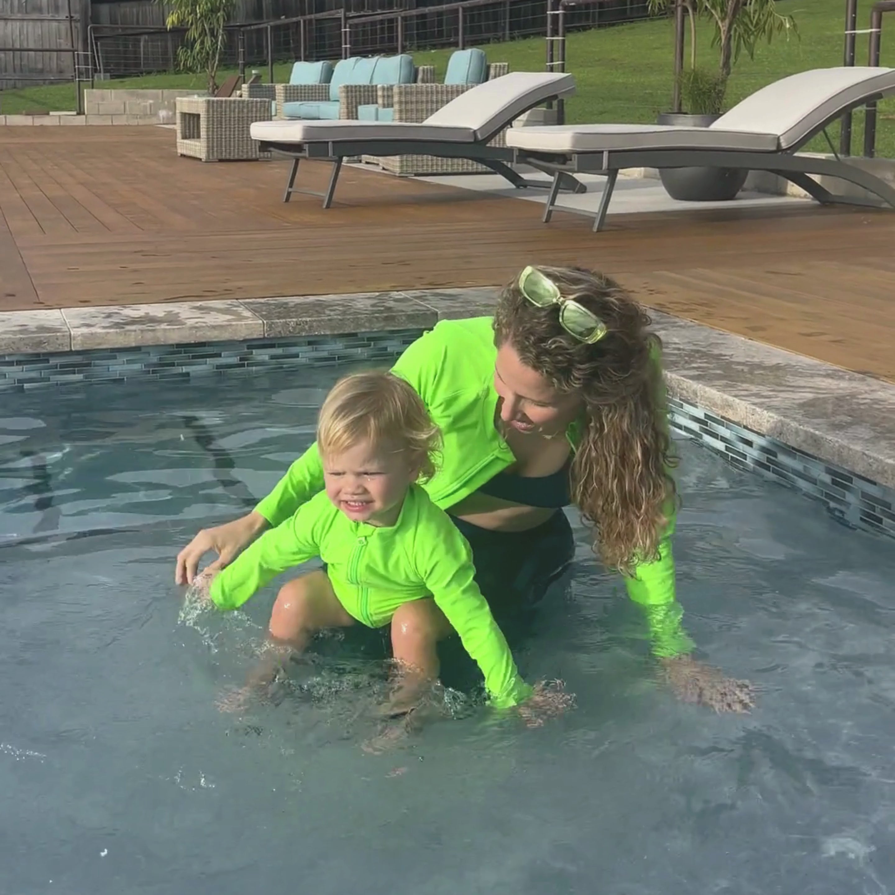 Why neon swimsuits? Besides being fun, bright and several of the best swimsuit colors for visibility, neon are also some of the safest swimsuit colors. There has been much recent discussion about bathing suit color safety and the best swimsuit colors underwater. This vivid neon green is one of the best swimsuit colors for safety ...and it’s just too cute!