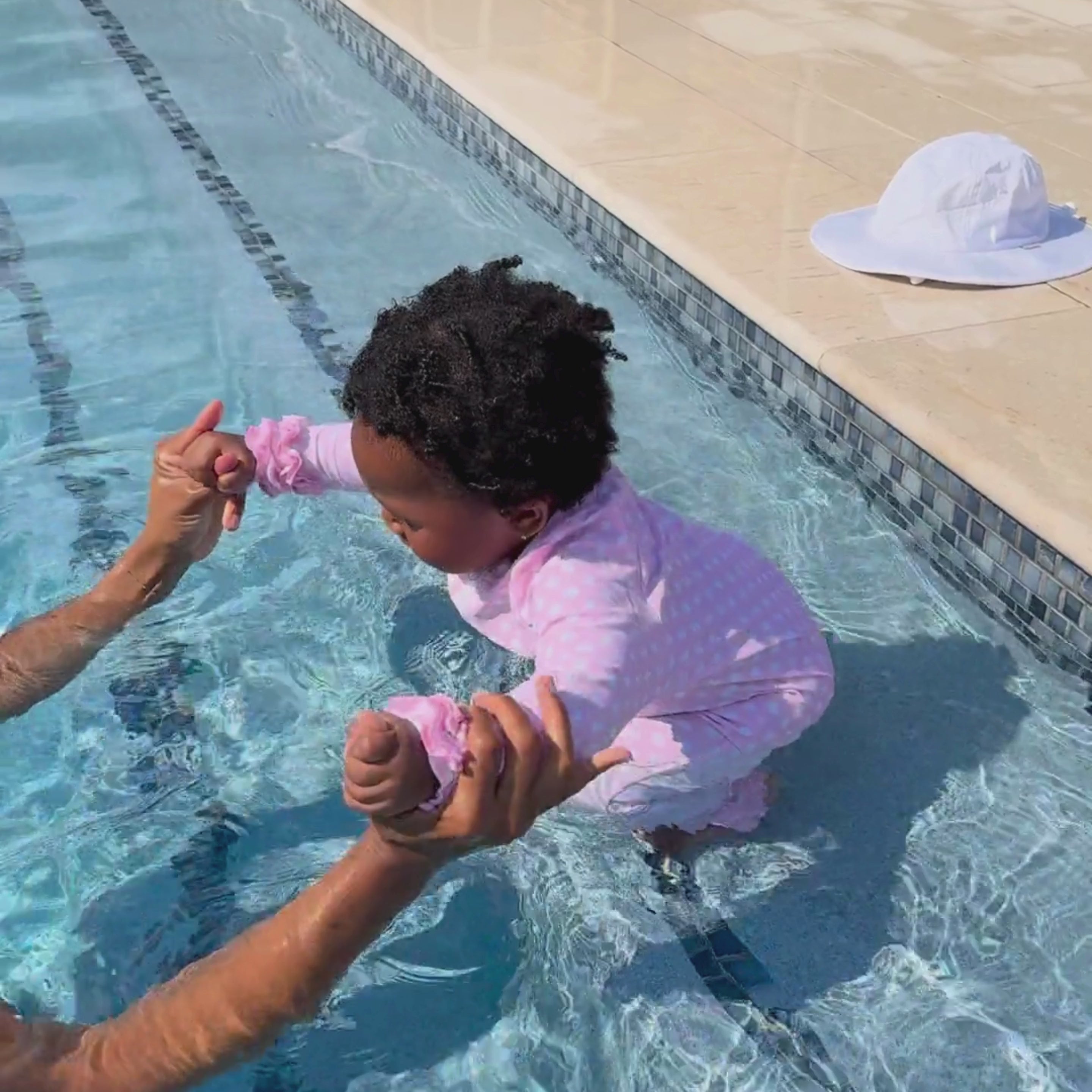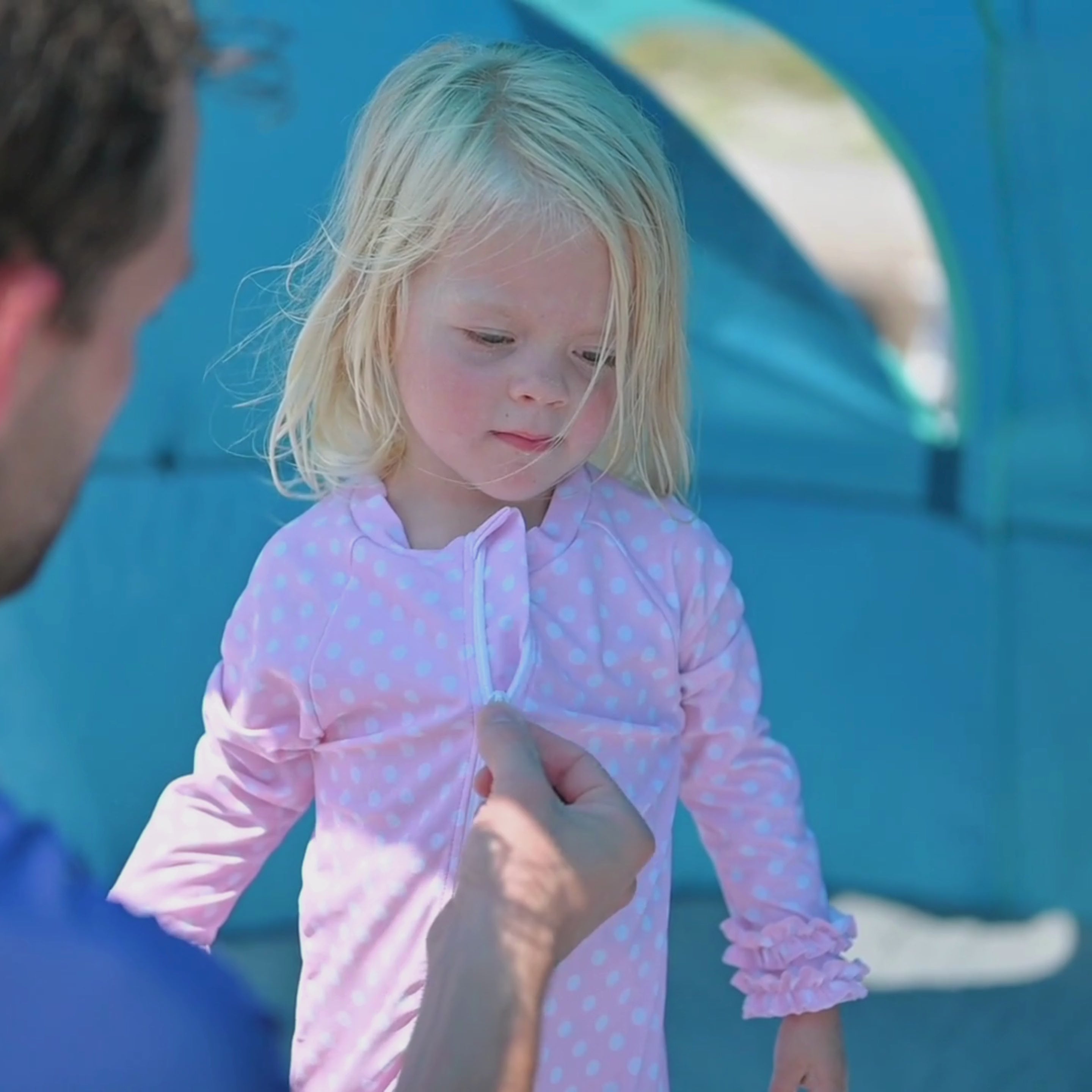 Our infant and toddler long sleeve sunsuit is full of features to make fun-in-the-sun a breeze. With neck to wrist to ankle sun protection, there will be no more sunscreen-slick wiggly little, squirming out of your arms. They are protected from the sun’s rays anywhere this sunsuit covers!