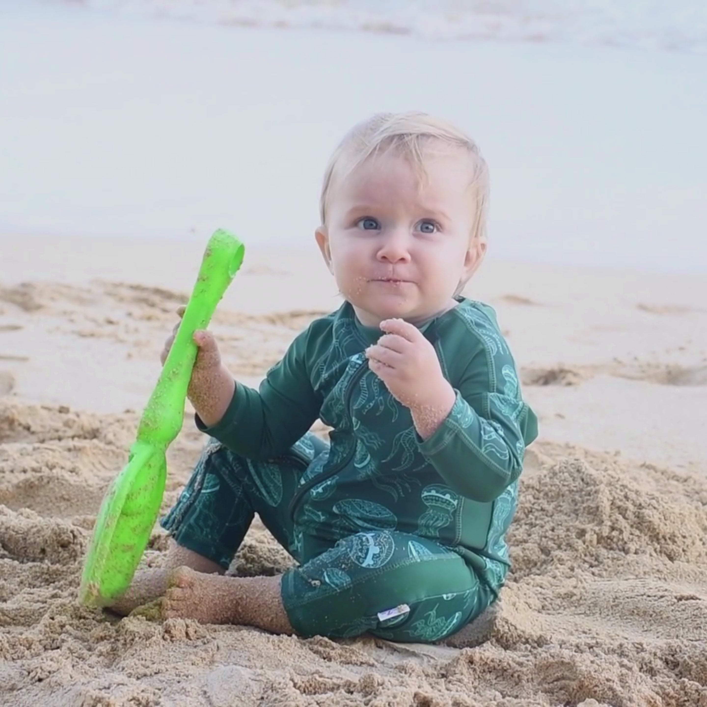 Our one-piece long sleeve hunter green with aqua jellyfish sunsuit is perfect for splashing and playing all day long.