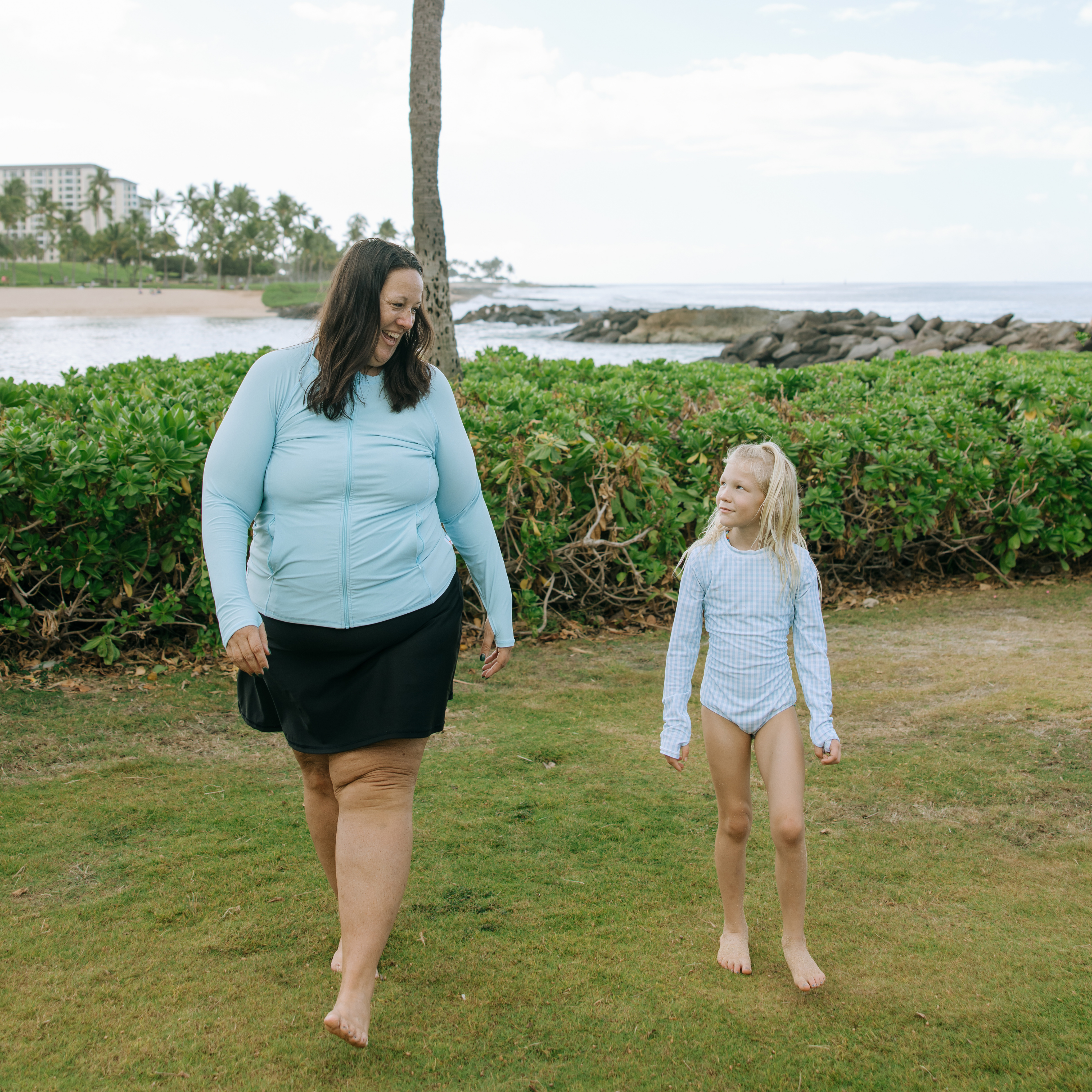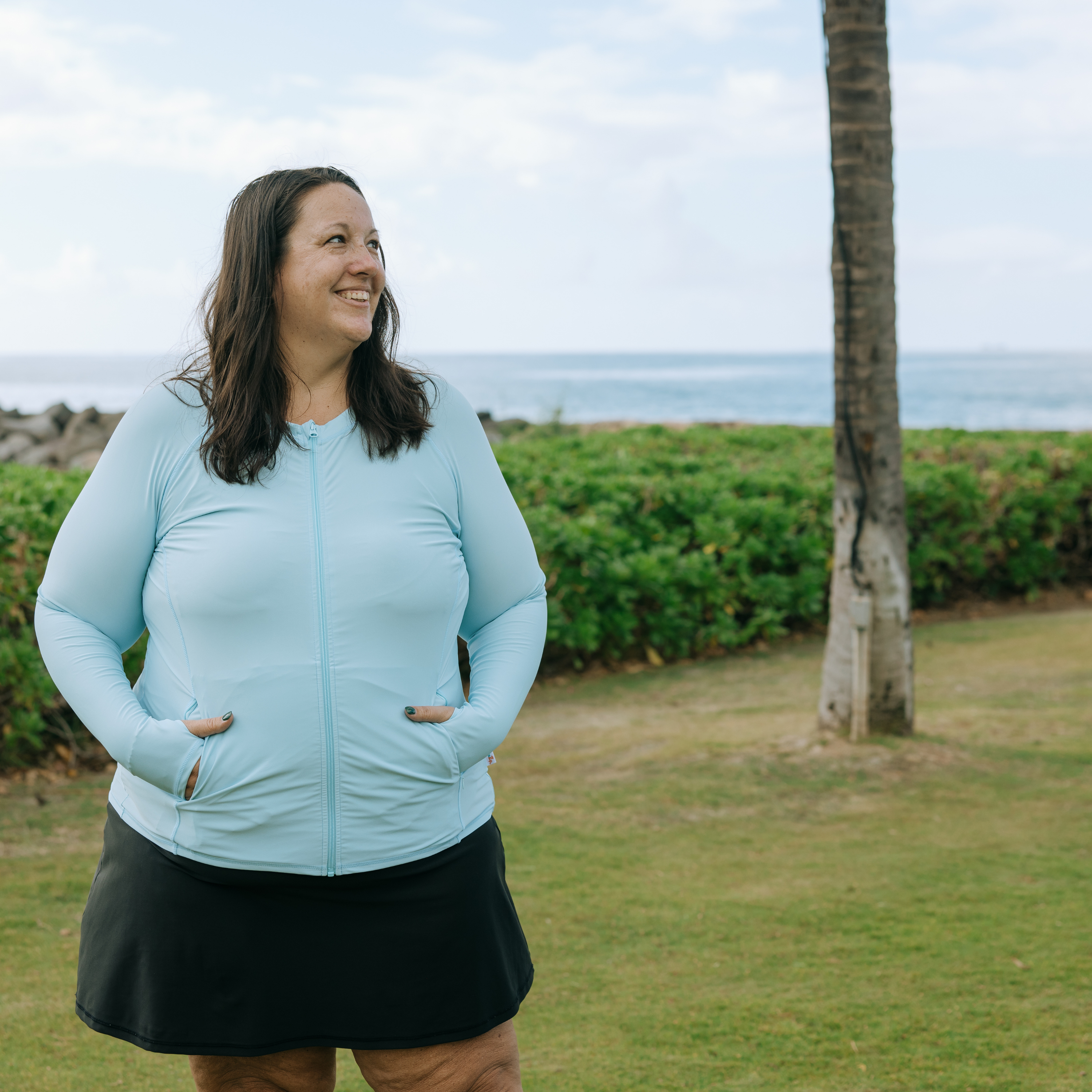 Our women’s long sleeve zipper rash guard looks great and gives easy all day sun protection both in and out of the water.