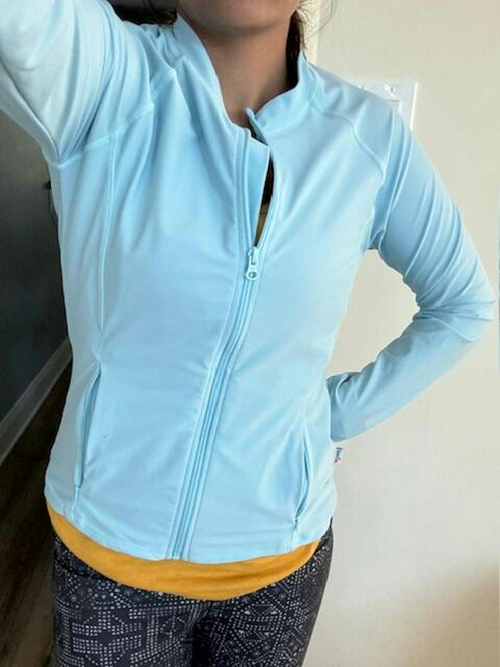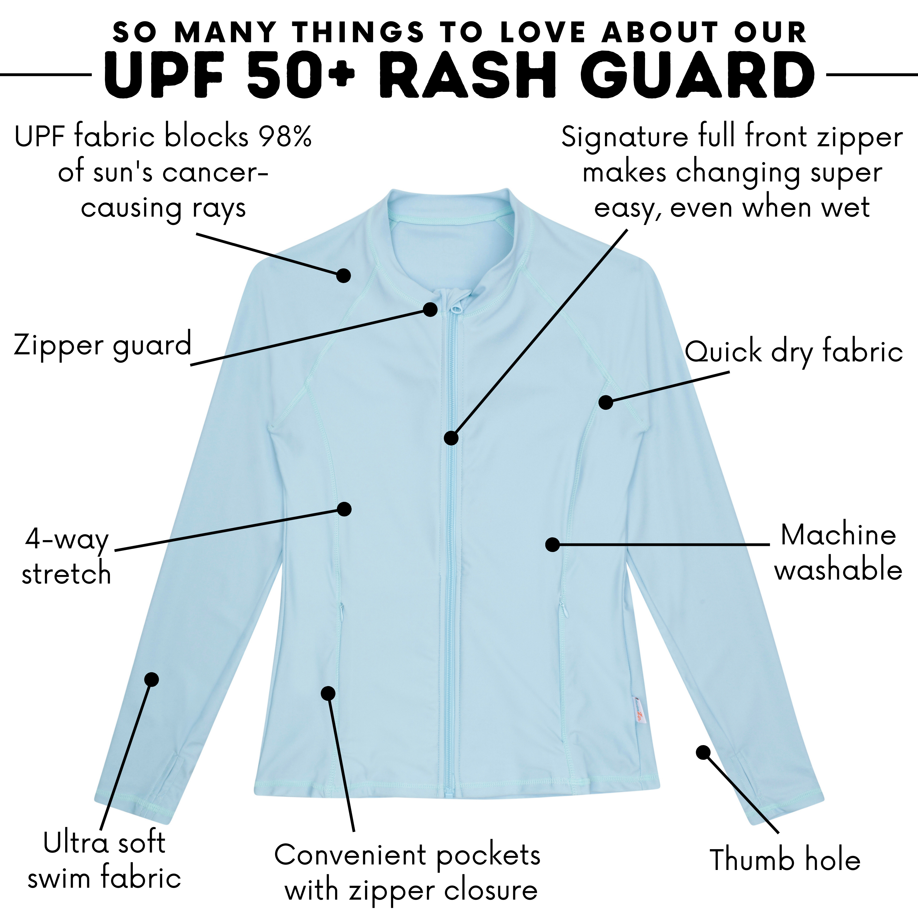 This women's long sleeve rash guard swim shirt is the perfect thing to wear for the pool, an outdoor hike or running errands. With a relaxed, easy fit it's the perfect thing to keep you cool and covered every day! It features front pockets with zipper closures, thumb holes, a zipper guard along the inside of the zipper to reduce rubbing/irritation and loads more details to make it your favorite go-to swim jacket.