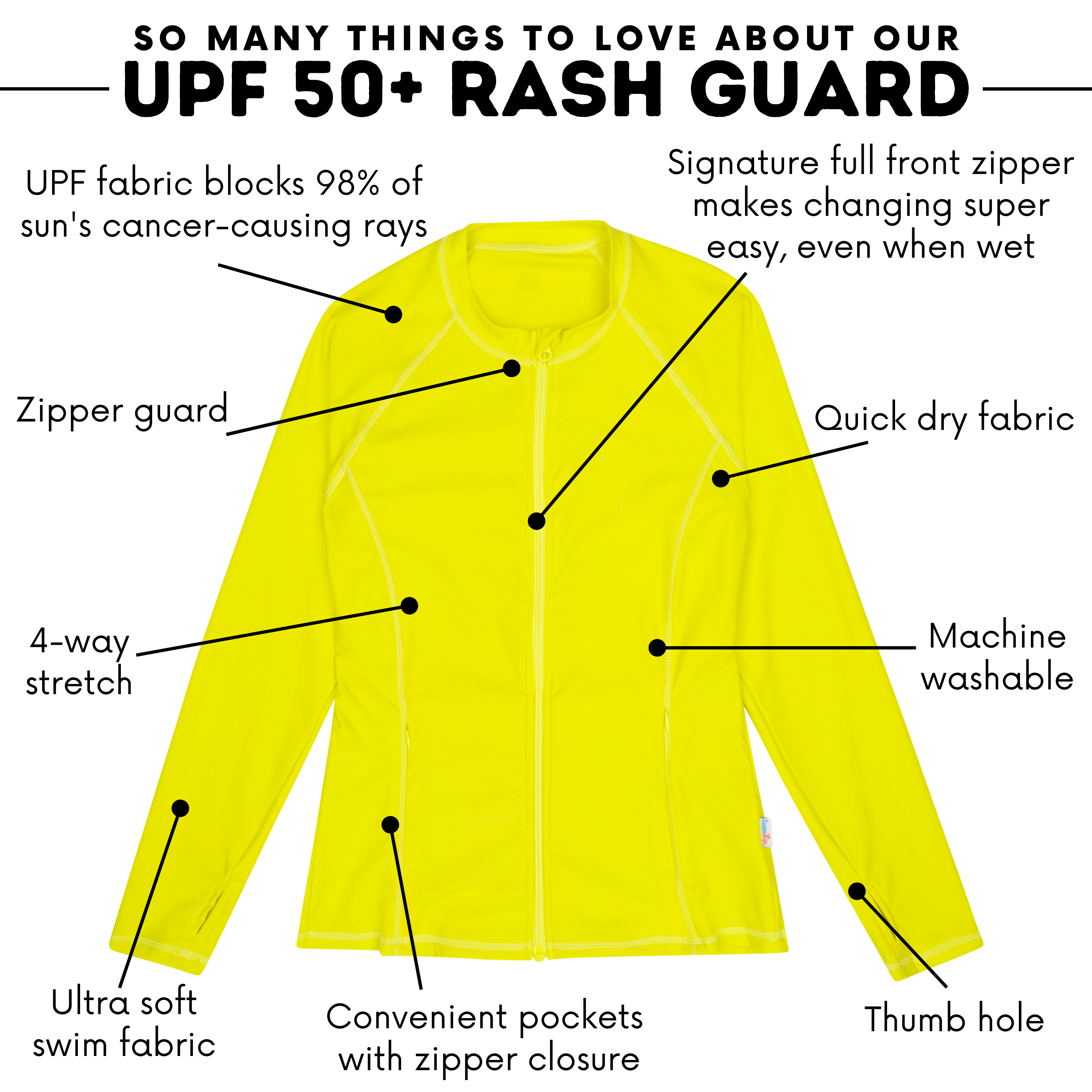 This women's long sleeve rash guard swim shirt is the perfect thing to wear for the pool, an outdoor hike or running errands. With a relaxed, easy fit it's the perfect thing to keep you cool and covered every day! It features front pockets with zipper closures, thumb holes, a zipper guard along the inside of the zipper to reduce rubbing/irritation and loads more details to make it your favorite go-to swim jacket.